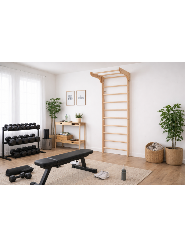 - Capacità di carico: scala svedese fino a 150 kg, barra superiore fino a 100 kg.