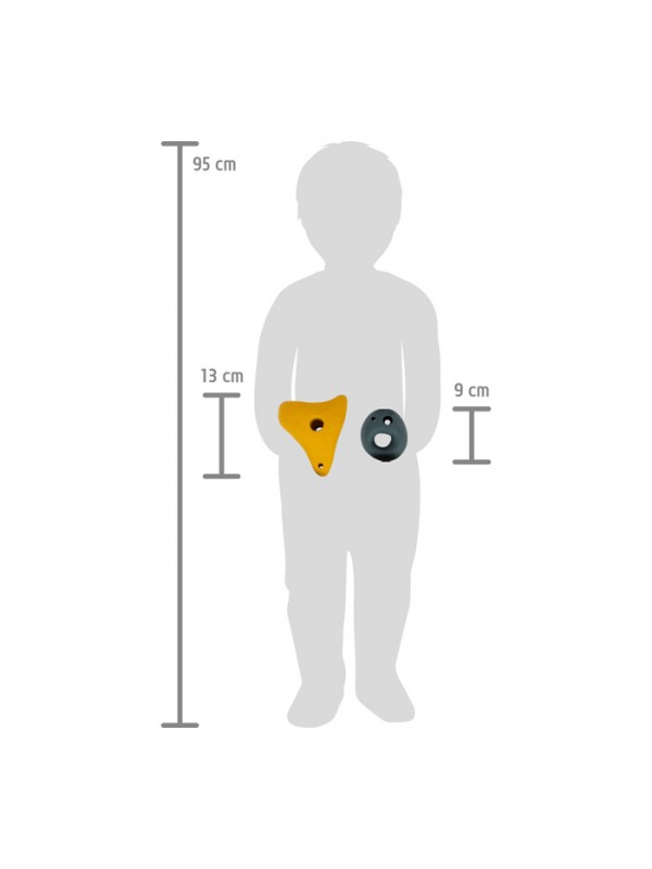 Realizzate in materiale resistente e di diverse forme, le prese sono progettate per non girarsi improvvisamente grazie al sistema di montaggio a due punti. I bambini le afferrano facilmente grazie alla dimensione adatta e alla superficie strutturata, garantendo un'arrampicata sicura e piacevole, adatta all'età e alle capacità.