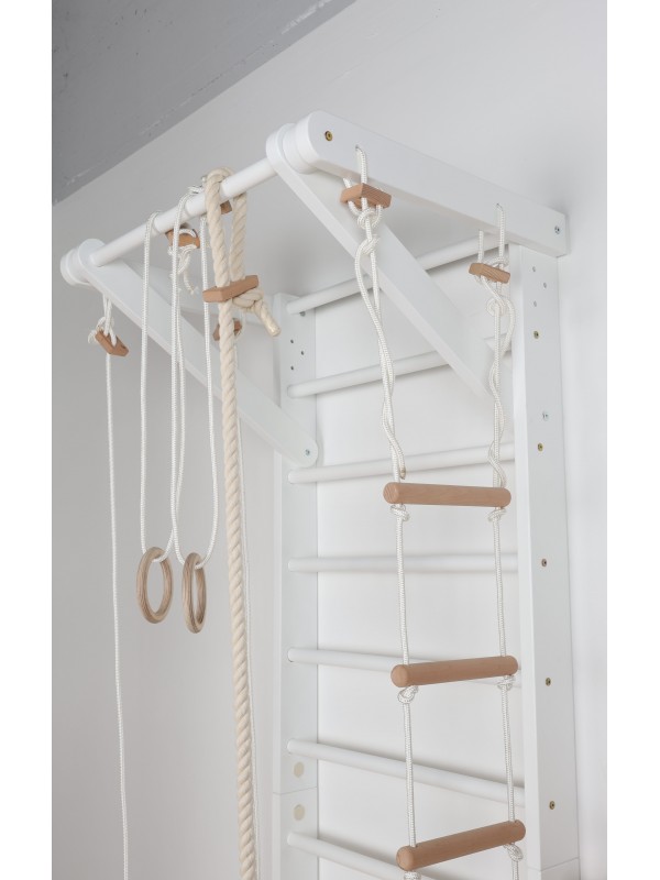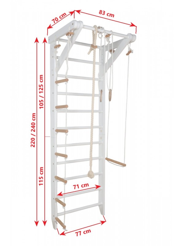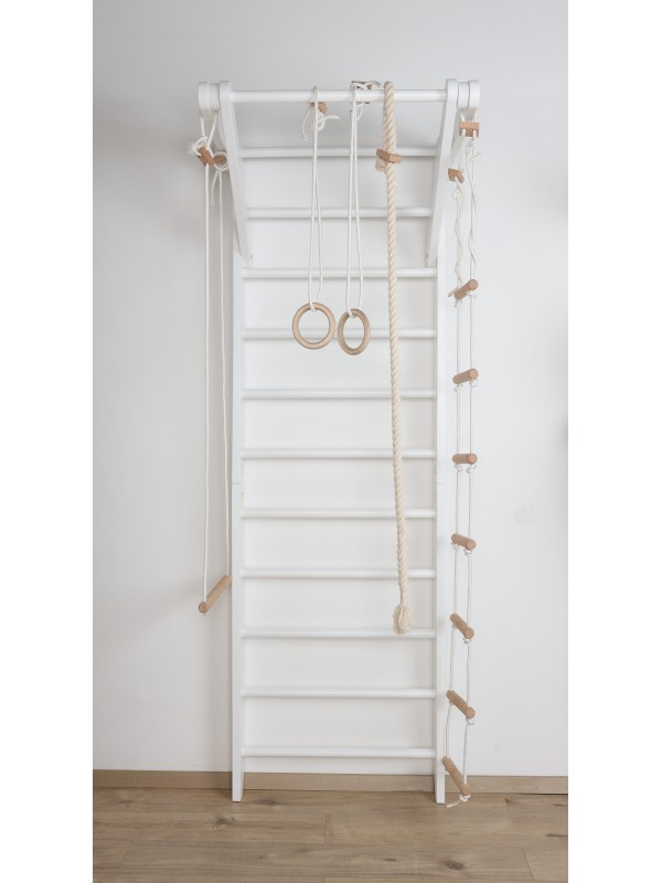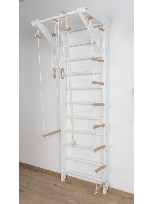Cerchi un attrezzo sportivo multifunzionale che entusiasmi i bambini e permetta anche agli adulti di allenarsi? La nostra scaletta a muro in legno elegante di colore bianco con accessori è la soluzione perfetta per uno stile di vita attivo a casa – sicura, compatta e realizzata con materiali naturali di alta qualità. Il suo colore chiaro si adatta a ogni ambiente, trasmettendo sensazione di freschezza e pulizia.