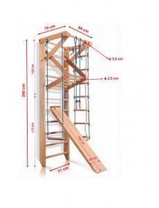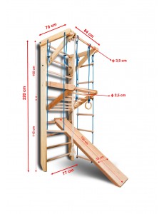 - Dimensioni: larghezza interna 71 cm, altezza 220 cm o 240 cm (a seconda dell’opzione scelta), diametro dei pioli 3,5 cm, scivolo 150 × 35 cm