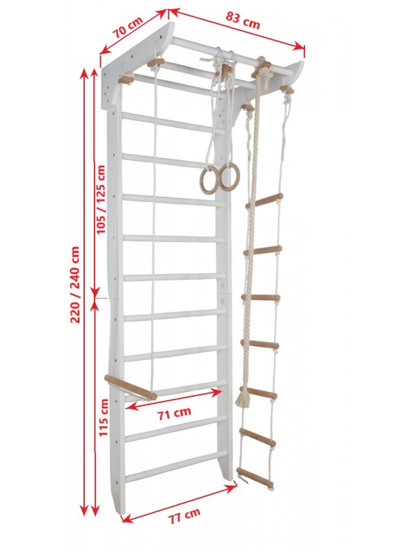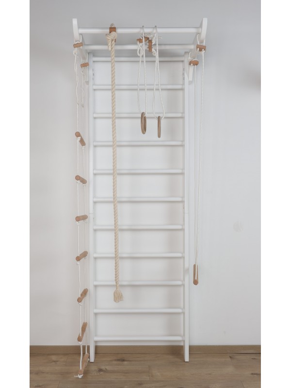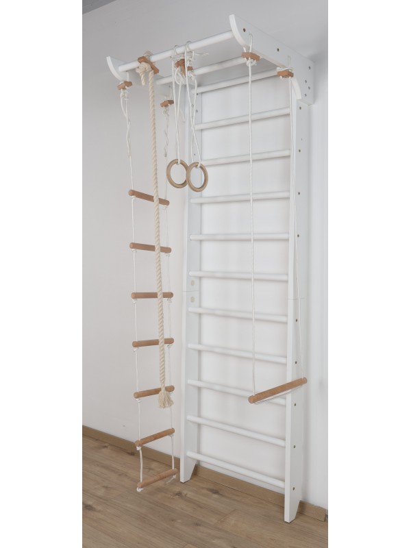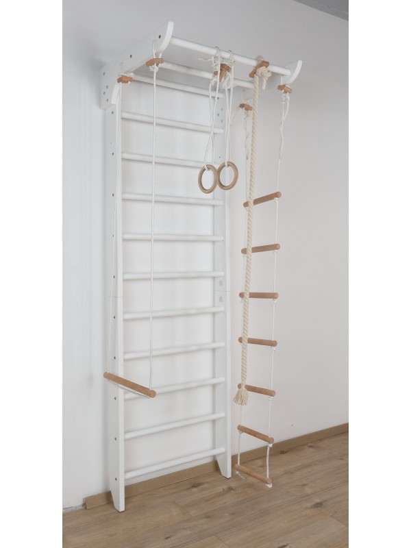 Cerchi un attrezzo sportivo multifunzionale che entusiasmi i bambini e permetta anche agli adulti di allenarsi? La nostra scaletta a muro in legno elegante di colore bianco con accessori è la soluzione perfetta per uno stile di vita attivo a casa – sicura, compatta e realizzata con materiali naturali di alta qualità. Il suo colore chiaro si adatta a ogni ambiente, trasmettendo sensazione di freschezza e pulizia.
