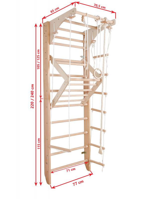 - Portata: Scaletta fino a 150 kg | Barra superiore mobile fino a 80 kg | Asta triangolare rimovibile fino a 50 kg | Elementi sospesi sulle corde fino a 60 kg